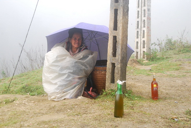 | Bà già người Mông trùm kín ni lông để đỡ rét, bán mật ong ven đường - Ảnh: Hồng Thảo |