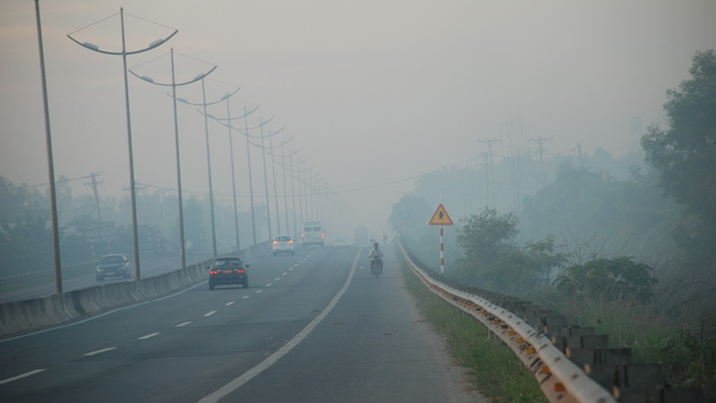 | Hơn 7g sáng, đường dẫn vào đường cao tốc TP.HCM - Trung Lương bị sương mù bao phủ nên tầm nhìn xa của tài xế bị hạn chế - Ảnh: Mậu Trường |