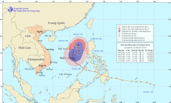 Dự báo trong 24 giờ tới, bão di chuyển theo hướng Đông Bắc sau đó có khả năng di chuyển về phía Nam Đông Nam, mỗi giờ đi được khoảng 5 - 10 km. Đến 04 giờ ngày 09/12, vị trí tâm bão ở vào khoảng 17,2 độ Vĩ Bắc; 117,6 độ Kinh Đông, cách quần đảo Hoàng Sa khoảng 570km về phía Đông Đông Bắc. Sức gió mạnh nhất ở vùng gần tâm bão mạnh cấp 10, cấp 11 (tức là từ 89 đến 117 km một giờ), giật cấp 12, cấp 13.
