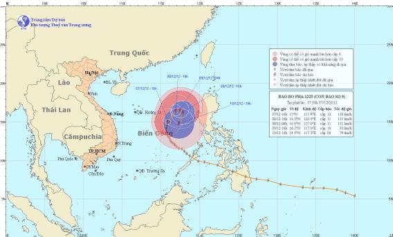 Trong khoảng 24 đến 48 giờ tiếp theo, bão di chuyển chậm theo hướng Đông Bắc, sau đó có khả năng đổi hướng di chuyển về phía Đông Nam, mỗi giờ đi được khoảng 5km. Đến 16 giờ ngày 09/12, vị trí tâm bão ở vào khoảng 16,2 độ Vĩ Bắc; 117,8 độ Kinh Đông, cách quần đảo Hoàng Sa khoảng 610km về phía Đông Đông Nam. Sức gió mạnh nhất vùng gần tâm bão mạnh cấp 10 (tức là từ 89 đến 102 km một giờ), giật cấp 11, cấp 12.