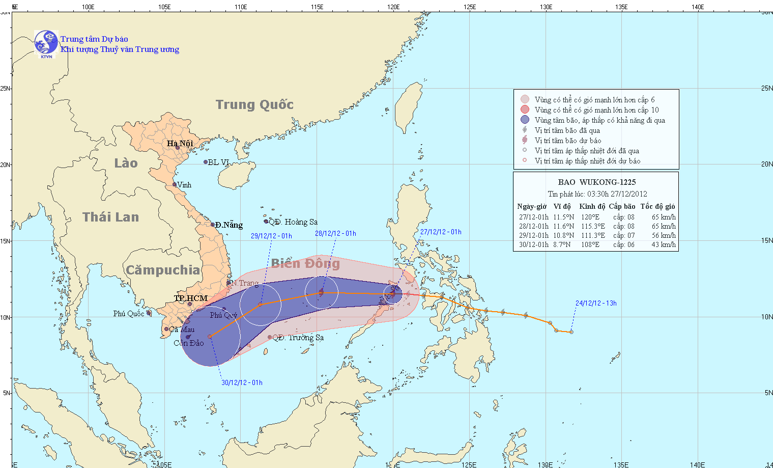 Dự báo trong 24 giờ tới, bão di chuyển chủ yếu theo hướng Tây, mỗi giờ đi được khoảng 25km, vượt qua khu vực phía Bắc đảo Palawan (Philippin) và đi vào biển Đông. Đến 01 giờ ngày 28/12, vị trí tâm bão ở vào khoảng 11,6 độ Vĩ Bắc; 115,3 Kinh Đông, cách đảo Song Tử Tây (thuộc quần đảo Trường Sa) khoảng 100km về phía Đông. Sức gió mạnh nhất vùng gần tâm bão mạnh cấp 8 (tức là từ 62 đến 74km một giờ), giật cấp 9, cấp 10.