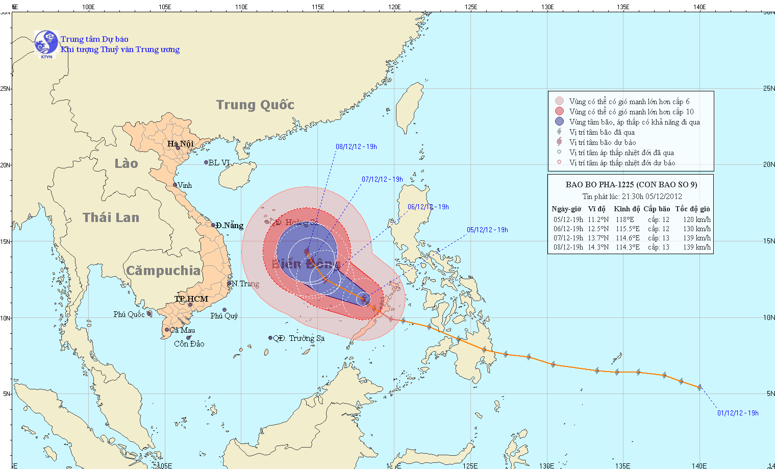 Dự báo trong 24 giờ tới, bão di chuyển theo hướng giữa Tây Tây Bắc và Tây Bắc, mỗi giờ đi được khoảng 10 - 15km. Đến 19 giờ ngày 06/12, vị trí tâm bão ở vào khoảng 12,5 độ Vĩ Bắc; 115,5 độ Kinh Đông, cách đảo Song Tử Tây (thuộc quần đảo Trường Sa) khoảng 180km về phía Đông Bắc. Sức gió mạnh nhất vùng gần tâm bão mạnh cấp 12, cấp 13 (tức là từ 118 đến 149 km một giờ), giật cấp 14, cấp 15.