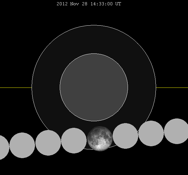 | Mô phỏng đường đi của Mặt Trăng qua bóng Trái Đất ngày 28/11. |