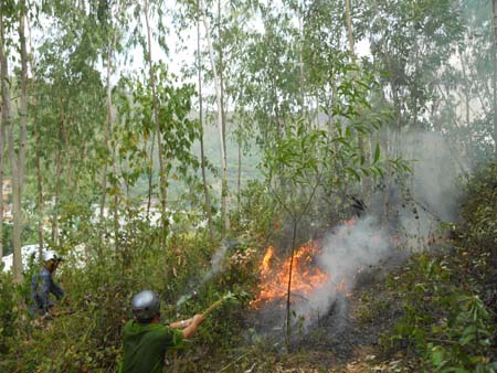 (09:13:26 AM 17/08/2012)Do thời tiết nắng nóng kéo dài, rừng có rất nhiều thực bì và lá khô nên lửa cháy dữ dội, lan nhanh từ trên đỉnh núi xuống khu vực gần nhà dân.
