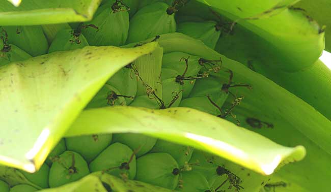 Hoa chuối nở trong nhiều tháng, khi nải chuối đầu tiên bắt đầu già hạt thì hoa vẫn nở đều, như cố tạo càng nhiều quả càng tốt để duy trì sự tồn tại trong điều kiện khắc nghiệt của tự nhiên (ảnh 4, 5).