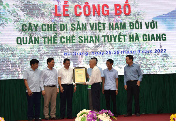 GS.TSKH Đặng Huy Huỳnh, anh hùng Đa dạng sinh học ASEAN, Phó Chủ tịch Hội BVTN&MT Việt Nam trao Bằng công nhận Cây Di sản Việt Nam cho 1.324 cây Chè Shan tuyết của 5 huyện vùng cao tỉnh Hà Giang Cụ thể có: 1.324 cây được công nhận lần này và 304 cây Chè Shan tuyết được công nhận từ hai lần trước (năm 2015 và 2019) 20 cây thuộc loài khác (9 cây Chò chỉ ở Bắc Mê 10 cây Đa ở Đồng Văn và 01 cây Thông đỏ - loài cực kỳ quý hiếm ở Thía Phìn Tùng - Đồng Văn).