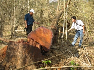 Chúng tôi tiếp tục đi sâu vào rừng, những gì chứng kiến khiến các thành viên trong nhóm đều xót xa trước cảnh tan hoang của khu rừng cấm lớn nhất nước này. Trong vòng bán kính hơn 1km mà chúng tôi đi qua không còn bóng dáng các loại gỗ quý như trắc, cẩm lai, cẩm chỉ, cà te, giáng hương. Nơi đâu cũng thấy ngổn ngang những gốc cây gỗ căm xe, chiêu liêu, cà chít… vừa bị lâm tặc đốn hạ. Thậm chí nhiều cây căm xe, chiêu liêu… non, có đường kính chưa tới 30cm cũng bị lâm tặc đốn hạ, lấy đi phần thân thẳng nhất.