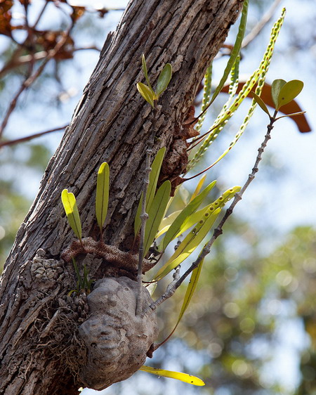 (09:34:17 AM 18/08/2012)Đó là một loài cây có tên gọi là cây ổ kiến, bí kỳ nam hoặc kỳ nam kiến, xuất hiện tại các khu rừng ở Tây Nguyên. Loài cây thường này sống bám trên các cây thân gỗ lớn, có thân phình thành củ lớn, mặt ngoài sần sùi, thoạt nhìn trông như một khối u dị dạng xuất hiện trên thân cây chủ.