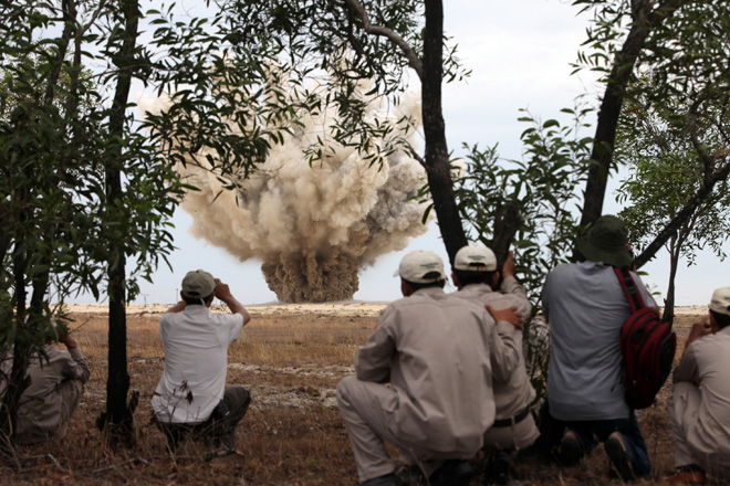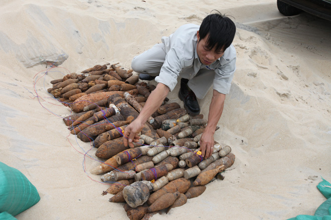 Cứ vào thứ sáu, tất cả bom mìn rà được trong tuần của các đơn vị đều được mang về đây để tiêu hủy. Sáng nay có hai đơn vị là SODI và Peace Tree thực hiện công việc này. Mặc dù đây là công việc thường xuyên nhưng không phải lúc nào cũng có cơ hội để tận mắt chứng kiến việc hủy những quả bom nặng cả ngàn cân Anh do Mỹ ném xuống Quảng Trị trong chiến tranh.