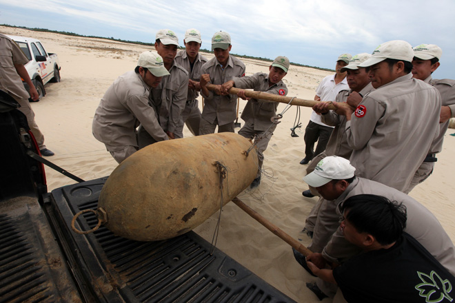 | Nhân viên của Tổ chức Peace Tree khuân quả bom từ trên ôtô xuống để mang đi hủy |