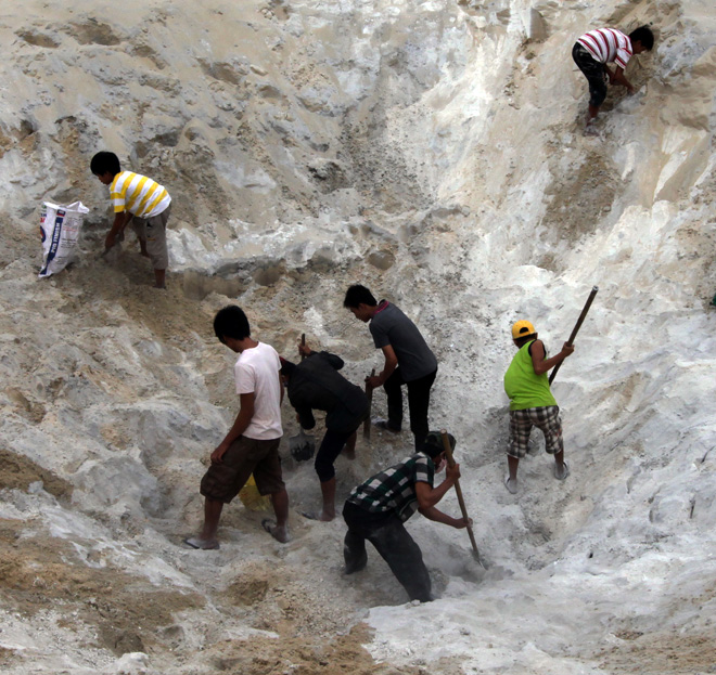 | Sau khi đã thấy an toàn, những em nhỏ quanh vùng ào xuống hố bom vừa nổ để nhặt miểng bom bán phế liệu |