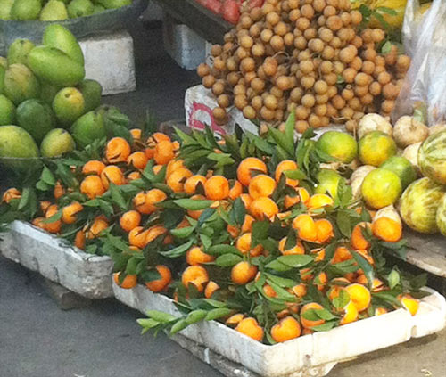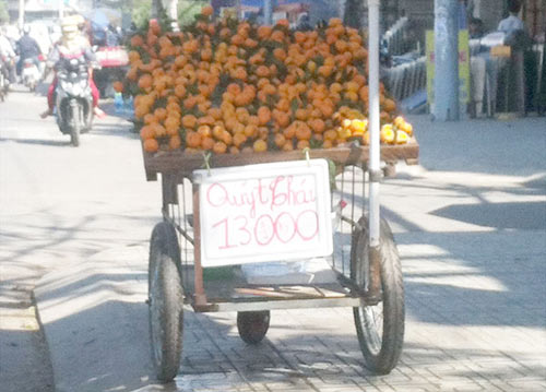 (16:10:45 PM 23/12/2012)Trên các tuyến đường Nguyễn Thái Sơn, Nguyễn Văn Lượng (Q.Gò Vấp), Cách Mạng Tháng Tám, Tô Hiến Thành (Q.10)… hàng loạt xe đẩy chất đầy quýt, gắn bảng ghi “Quýt Thái” 26.000đ/kg. Ghé vào một xe đẩy trên đường Nguyễn Văn Lượng (Q.Gò Vấp) hỏi mua, người bán mau miệng mời chào: “Quýt Thái Lan ngon ngọt, hàng đảm bảo tươi mới, chị xem cuống lá còn xanh thế này thì không sợ hàng cũ”.