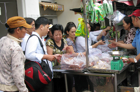 Tại quầy giò lụa, bánh chưng trong chợ Thái Bình, quận 1, khách vây kín. Người bán không trả lời hết các thắc mắc của người mua mà người đến sau phải hỏi lại giá cả, thời hạn dùng... từ người đến trước. Mỗi kg giò lụa ở đây giá 150.000 đồng, giò thủ 120.000 đồng. Chiếc bánh chưng 0,5 kg giá 60.000. Người mua ít cũng nửa kg, mua nhiều thì 3-4 kg giò, bánh.