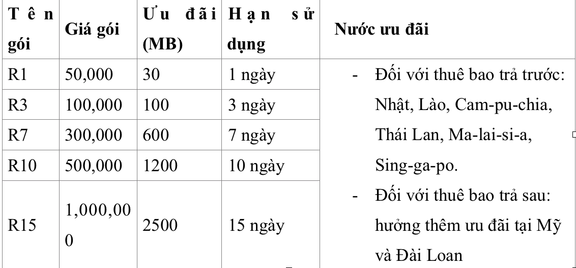 Mức cước thấp chưa từng có này được VinaPhone cung cấp theo nhiều gói đáp ứng các mức nhu cầu của khách hàng. Với những khách hàng đi công tác ngắn ngày, gói R1 (50.000 có ngay 30MB data/ ngày) hoặc gói R3 (100.000 có ngay 100 MB/3 ngày) là lựa chọn vừa tiết kiệm chi phí vừa duy trì kết nối thuận tiện. Bên cạnh đó, các gói dung lượng lớn, thời gian sử dụng dài hơn, đơn giá thấp hơn như R7 (300.000 có ngay 600 MB/7 ngày), R10 (500.000 có ngay 1200 MB/10 ngày); R15 (1 triệu đồng có ngay 2500 MB/15 ngày) cũng được cung cấp để phục vụ cho nhu cầu lưu trú dài ngày tại nước ngoài.