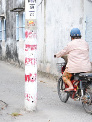 | Trụ điện “đứng” giữa hẻm nối đường Ngô Quang Nhã với đường Hòa Bình khoảng sáu năm nay |