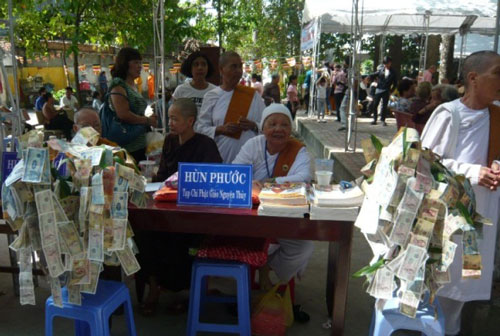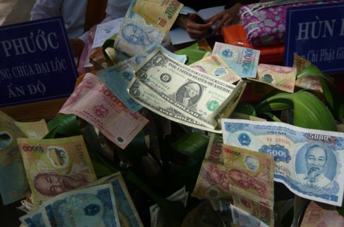 Đã từng nghe nói về cây như ý, nhưng đây là lần đầu tiên tôi tận mắt thấy “cây tiền”. Đủ loại mệnh giá, có đủ tiền Việt, tiền Đô. Tiền nhiều phước nhiều? Tiền ít phước ít? Vậy những người nghèo ra sao? Ai biểu sinh ra nghèo chi, đáng tội, phước ít?