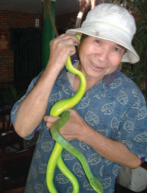 Một người đàn ông dáng nhỏ đang đứng giữa quán càphê, tay trần moi từ lồng sắt ra từng con, từng nhúm lớn rắn lục xanh óng, có con bụng to vì đang có chửa! Ông giảng giải: “Con thon hơn, có sọc ở bụng là rắn lục đực, con không có sọc là rắn cái”. Hứng chí, ông cầm một con to gần bằng cổ tay đưa lên… lim dim ngoáy tai, rồi phát biểu cảm tưởng: “Nhột nhột, đã ngứa lắm, sướng hơn thợ hớt tóc ráy tai!” Nói đoạn, ông chuyển sang tôi và mấy người khách: “Không tin… ráy thử coi?!” Thiệt là hết biết! Tôi và mấy ông khách né chạy thục mạng. Có người hỏi “Không sợ rắn độc cắn à?”, ông đáp tỉnh queo: “Tui có uống thuốc trị rồi, không sao! Loại thuốc gia truyền trị độc này được chế cũng chính từ nọc rắn”.