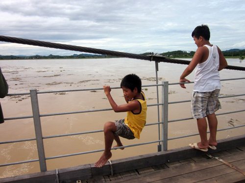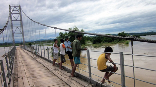 Để “mãn nhãn” với cảnh nước lũ chảy qua chân cầu, nhiều trẻ em đã ra đứng giữa cầu treo để xem. Nhiều em nhỏ bất chấp nguy hiểm ngồi lên dây neo lan can cầu ngồi xem, đùa nghịch trong khi nước lũ đang cuộn ầm ầm dưới mặt cầu rất gần.