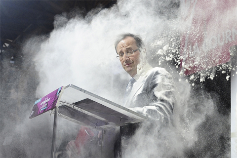 | Một phụ nữ hất bột lên ứng viên tổng thống Pháp Francois Hollande tại một sự kiện ở Paris hôm 1/2. Ông Holland sau đó thắng cử tổng thống trong cuộc bầu cử tháng 5. Ảnh: AP |