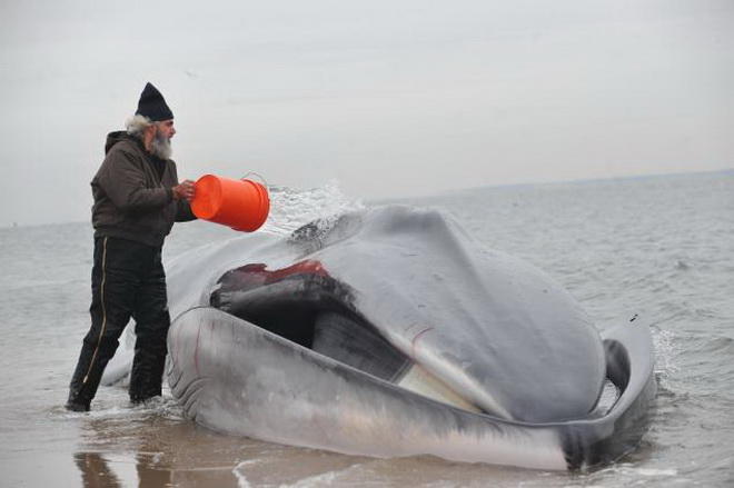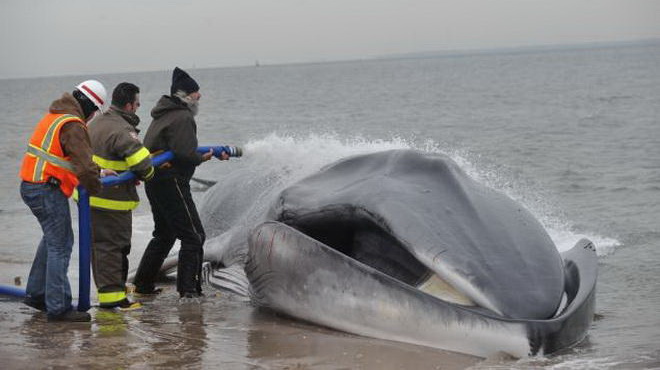| Các nhân viên cứu hộ tưới nước để giữ mạng sống cho con cá voi - Ảnh: New York Daily News |