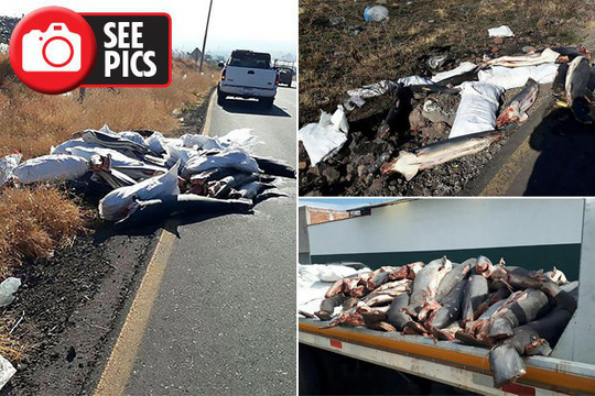 (12:04:50 PM 25/01/2018)(Tin Môi Trường) - Khoảng 300 xác cá mập không còn nguyên vẹn vừa được phát hiện trên vệ đường ở miền Tây Mexico, khu vực cách biển khoảng 241 km.