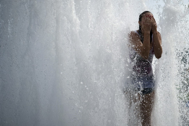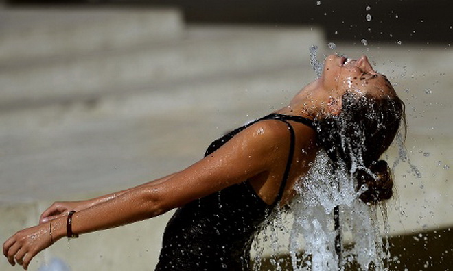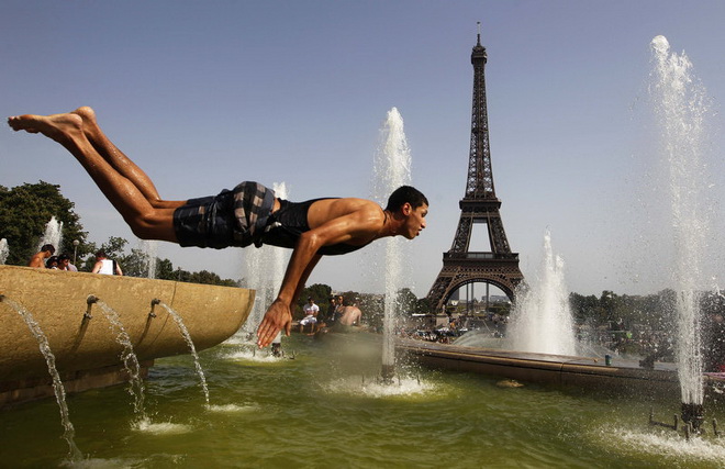 | Một chàng trai tận dụng vòi phun nước công cộng tại quảng trường Trocadero, phía trước tháp Eiffel, thủ đô Paris, Pháp để tắm mát. Nhằm tránh lặp lại tình trạng như năm 2003 khi 15.000 người Pháp chết vì nắng nóng, mới đây chính phủ đã ban bố cảnh báo cấp độ 2 trong hệ thống cảnh báo về sóng nhiệt 3 cấp độ tại đây - Ảnh: Reuters |