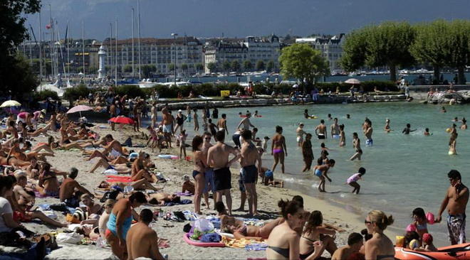 | Hồ Leman, Geneva, Thụy Sĩ chật cứng người tới tắm. Cơ quan Khí tượng liên bang nước này đã ban hành cảnh báo về một đợt nắng nóng kéo dài từ cuối tuần qua đến hết ngày 22-8 - Ảnh: Reuters |