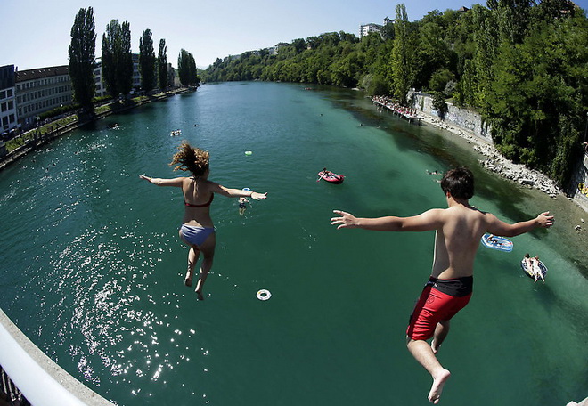 | Ở một góc khác tại Geneva, người dân không ngại ngần nhảy xuống dòng sông Rhone để tận hưởng chút mát lạnh giữa mùa hè nóng nực - Ảnh: Reuters |