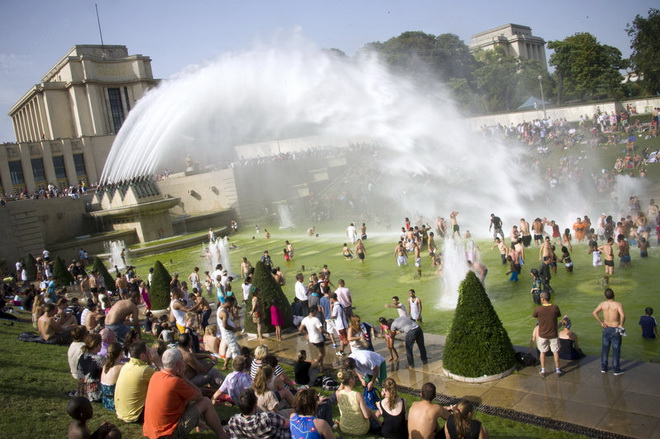 | Đông đảo người dân Paris đổ dồn về vòi phun nước công cộng tại quảng trường Trocadero - Ảnh: AFP |