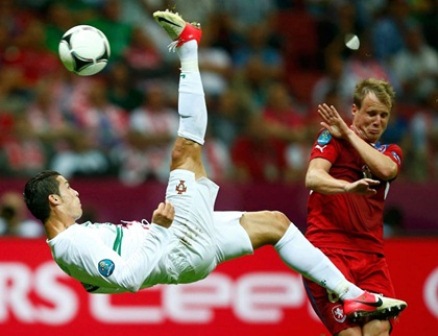 Cristiano Ronaldo (Bồ Đào Nha) thực hiện pha sút bóng kỹ thuật trước cầu thủ Mikhai Kadlec (CH Séc) trong trận tứ kết Euro 2012 tại Warsaw
