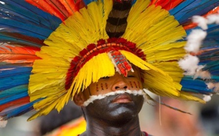 Thành viên nhóm người bản xứ Brazil tham gia lễ diễu hành chào đòn các nhà lãnh đạo tới dự Hội thảo Liên hiệp quốc về vấn đề phát triển ổn định hay còn gọi là Rio 20 được tổ chức tại thành phố Rio de Janeiro, Brazil