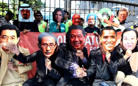 Các nhà hoạt động người Indonesia mang mặt nạ nguyên thủ quốc gia của nhiều nước thành viên nhóm G20