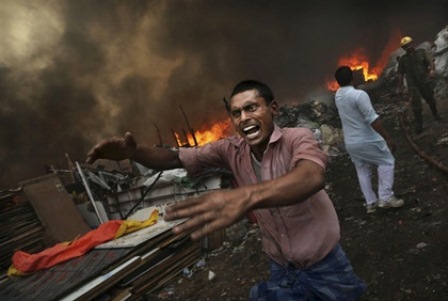Người đàn ông Ấn Độ hô hào mang nước dập lửa khi đám cháy lan rộng trong một khu ổ chuột ở thành phố New Delhi hôm 22/6