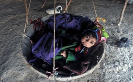 Bé gái người Afghanistan ngây thơ nằm trong nôi tại khu trại Kuci ở quận Karokh, tỉnh Herat