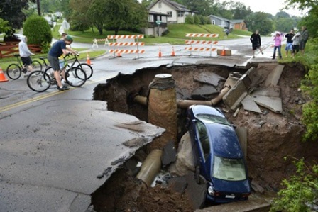 Chiếc xe hơi nằm gọn dưới hố sâu sau khi mưa lớn gây sụt đường ở thành phố Duluth, miền đông bắc Minnesota
