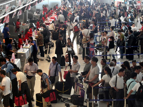 Sân bay Suvarnabhumi ở Bangkok hôm 28-10 đông nghẹt người chạy trốn nước lụt. Ảnh: BANGKOK POST