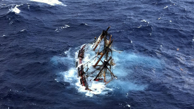 Chiếc tàu HMS Bounty dài 54m bị siêu bão Sandy nhấn chìm ngoài khơi Hatteras, North Carolina ngày 29-10. 14 thủy thủ đoàn được cứu, một phụ nữ thiệt mạng, còn thuyền trưởng đang mất tích - Ảnh: Reuters