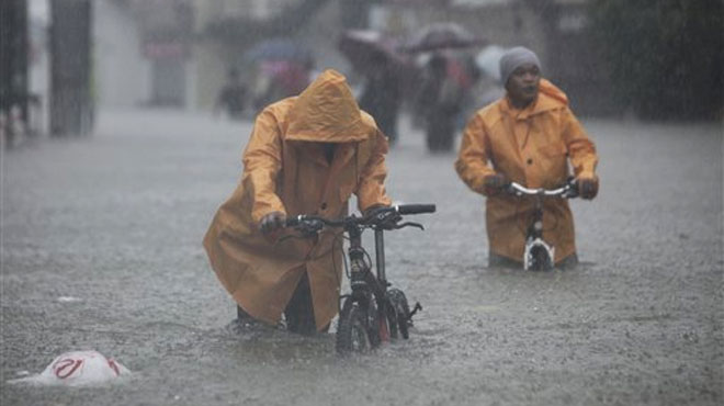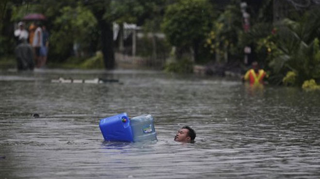 | Mưa lớn khiến nhiều vùng ở tỉnh Bulacan, Metro Manila ngập nặng hôm 6-8, nhiều người dân sống ở vùng trũng phải sơ tán, các lớp học đóng cửa - Ảnh: AP |