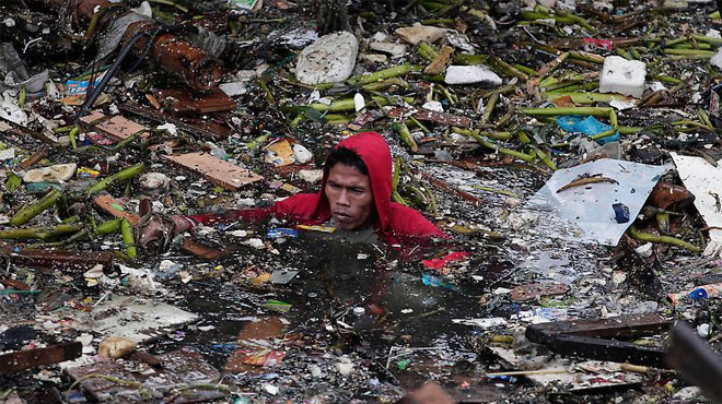 | Một cậu bé lội ra giữa dòng nước lũ để lượm đồ nhựa mang bán ở thành phố Quezon phía bắc thủ đô Manila hôm 6-8 - Ảnh: Reuters |