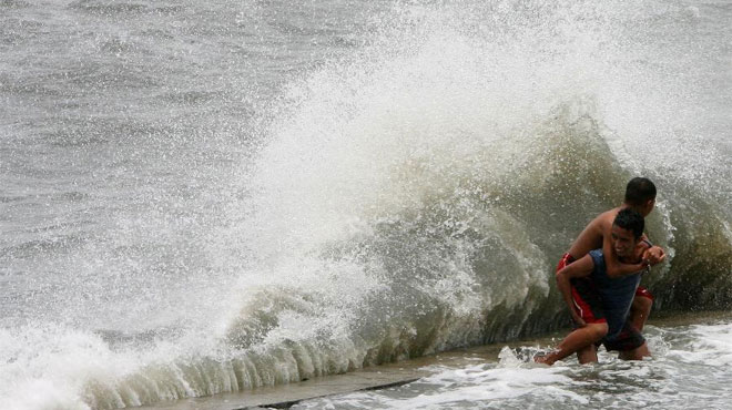 | Một người đàn ông gom rác do sóng đánh vào bờ. Bão Saola gây ảnh hưởng tới Philippines từ hôm 1-8 và mưa lớn từ hôm 5-8 khiến Manila cùng các tỉnh phía bắc đảo Luzon bị lụt nghiêm trọng - Ảnh: AP |