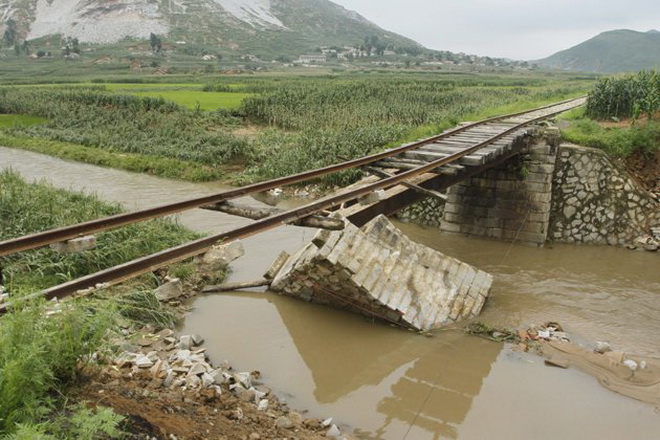 | Một cây cầu cho xe lửa đi bị phá hủy sau mưa lũ ở huyện Onchon - Ảnh: AP |