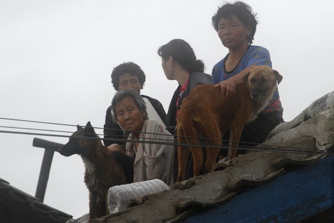 | Người dân leo lên các tầng cao, mái nhà để tránh lũ - Ảnh: KCNA, news.cn, AP |