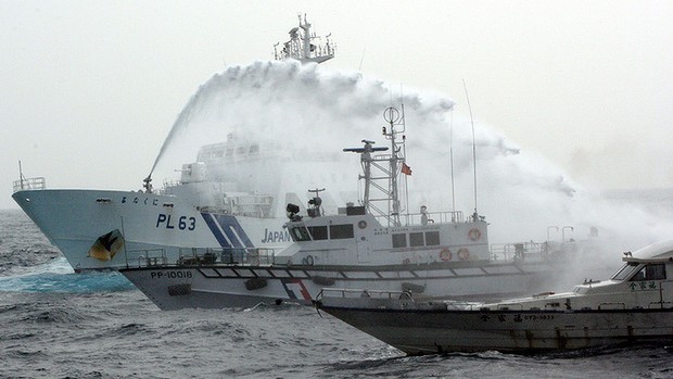 | Vòi rồng Nhật Bản nã thẳng vào tàu cá Toàn Gia Phúc được hộ tống bởi 4 tàu Cảnh sát biển Đài Loan |
