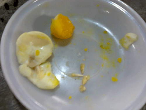 Chất lạ bên trong lòng đỏ trứng gà có hình dáng giống viên thuốc con nhộng (3 viên nhỏ màu trắng).