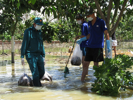 (14:43:09 PM 23/07/2012)Ngày 22/7, nhiều sinh viên tình nguyện và các lực lượng địa phương vẫn tiếp tục đào hang tìm xác chuột chết, vớt xác chuột thối rữa. Do hàng trăm ngàn con chuột bị chết ngộp trong hang nên mùi hôi thối nồng nặc.
