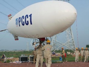(22:12:11 PM 25/08/2012)(Tin Môi Trường) - Ngày 25/8, tại xã Hợp Thịnh, huyện Hiệp Hòa (Bắc Giang), Tổng công ty Truyền tải điện quốc gia, Ban quản lý Dự án các công trình điện miền Trung và Công ty CP Xây lắp điện 1 đã tổ chức thi công đường dây 220kV nhánh rẽ vào trạm 500kV Hiệp Hòa đoạn vượt sông Cầu bằng khinh khí cầu.