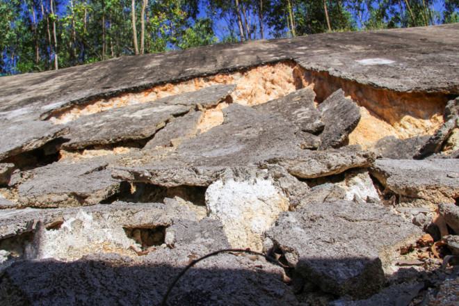 Theo thiết kế ban đầu, lớp bê tông tạo mái taluy sẽ có độ dày 10 cm. Tuy nhiên tại các tảng bê tông bị sụp, chỉ đo được khoảng 4-5 cm.