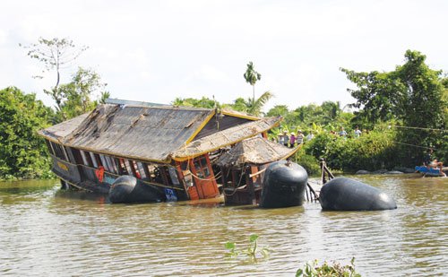 Do lượng nước còn nhiều trong khoang thuyền nên đơn vị trục vớt kéo một đầu tàu lên bờ (thuộc xã Nhị Bình, H.Hóc Môn, TP.HCM - đối diện với Khu du lịch Dìn Ký), một nửa tầng dưới của tàu vẫn còn chìm dưới nước. Tại hiện trường, đại tá Võ Đức Thành, Phó chỉ huy trưởng, tham mưu trưởng Bộ Chỉ huy quân sự tỉnh Bình Dương, cho biết: "Do thủy triều của sông Sài Gòn còn cao nên chưa thể hoàn thành việc lai dắt con tàu bị nạn về cảng Bà Lụa (P.Phú Thọ, TX Thủ Dầu Một) như dự kiến ban đầu".