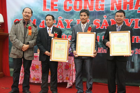 PGS. TS Nguyễn Đình Hòe trao bằng công nhận cụm bốn cây di sản cho lãnh đạo địa phương.