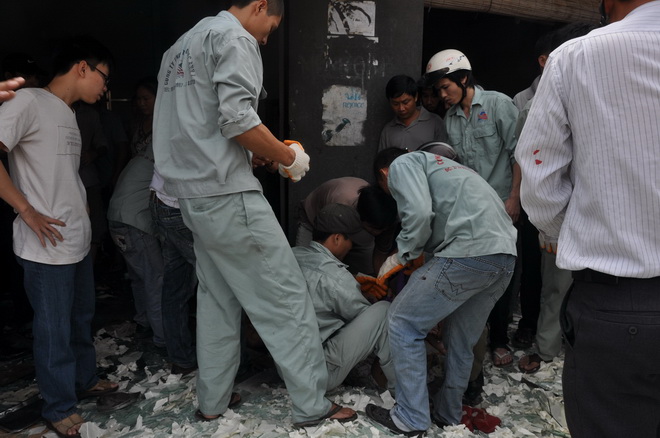 | Nạn nhân được đưa ra khỏi đống kính và chuyển đi cấp cứu |